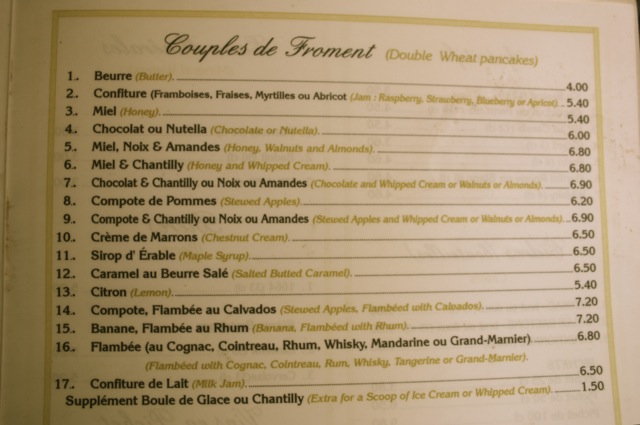 And then there were the crêpes. The street vendor crêpes are like mini challenges against the clock — you need to be finished eating before the flimsy wrapper is soaked with butter and too hot to hold (this can be managed with high heat tolerance or a hungry friend). Then there are the sit-down deluxe crepes that come filled with anything from roquefort cheese and spinach to stewed apples and whipped cream, making you wonder why every meal doesn't come in a pancake. These kinds of crepes we got at Josselin's, one of literally dozens of crêperies on Rue du Montparnasse in the 14th arrondissement.